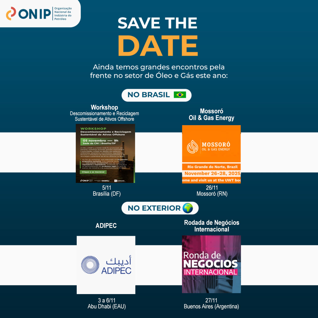 A Organização Nacional da Indústria do Petróleo (ONIP) promove, no dia 5 de novembro, em Brasília, um workshop sobre Descomissionamento e Reciclagem Sustentável de Ativos Offshore no Brasil.